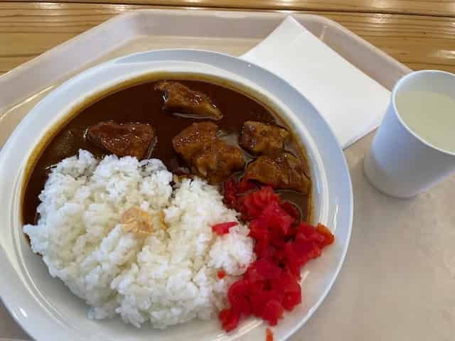 お肉がごろんごろんのカレー。福神漬け乗せ放題!